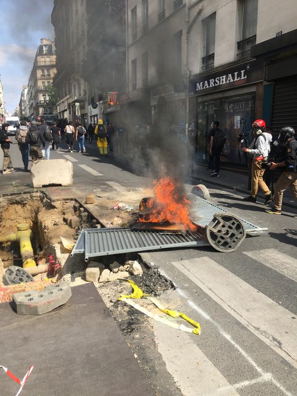 Les premières tensions ont eu lieu quelques minutes seulement après le départ du cortège, de la place de la République. Un groupe très mobile de manifestants, portant vêtements, gants et masques noirs, s’est détaché du cortège principal à hauteur de la rue Oberkampf pour se heurter aux forces de l’ordre.