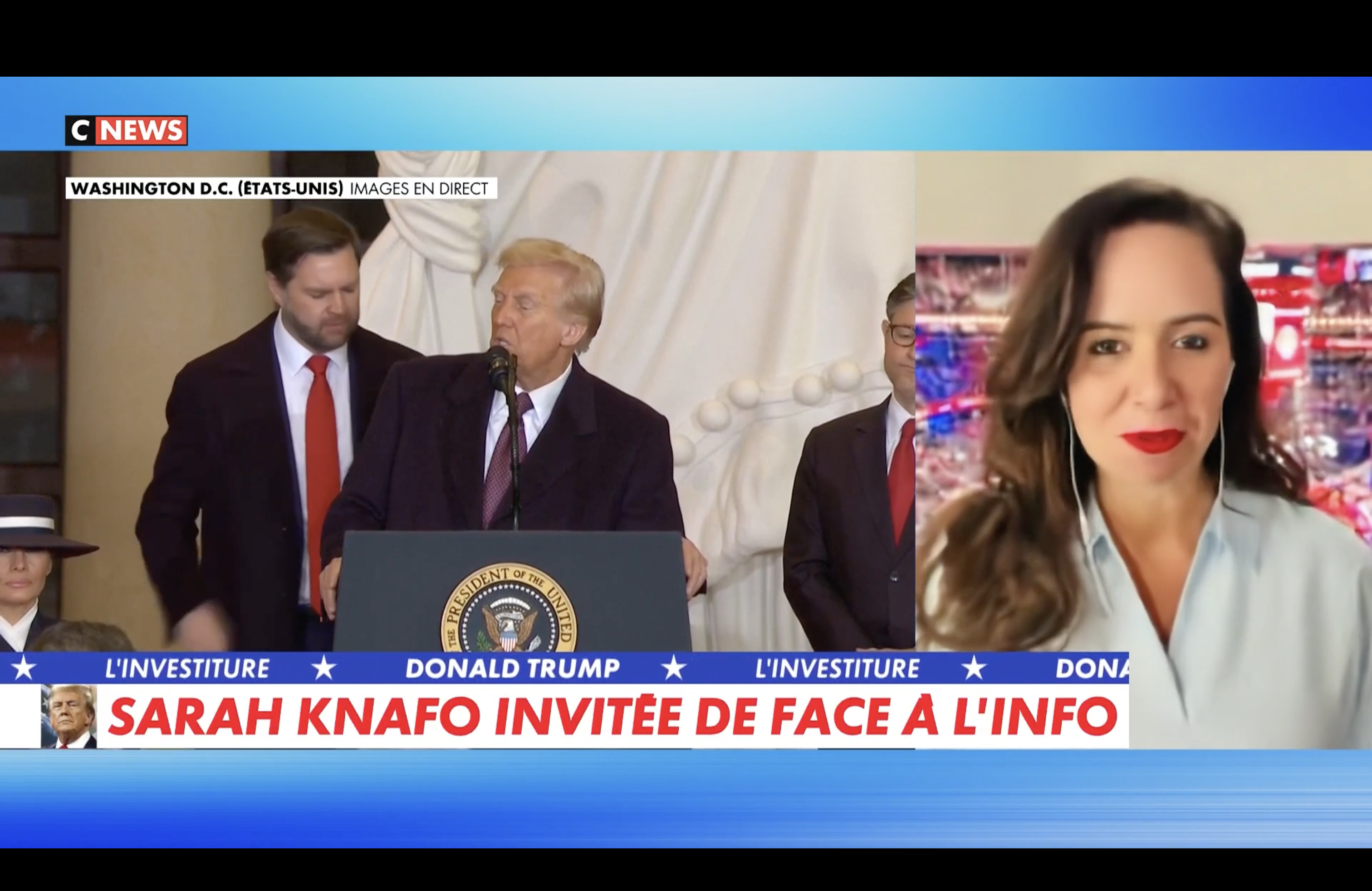 Sur BFMTV, Karine de Ménonville, elle, présente Sarah Knafo comme une « représentante » de la France. « Normalement, aux investitures de présidents américains, il n’y a pas vraiment de représentants de pays étrangers, mais vous y serez, ainsi que la première ministre italienne Georgia Meloni ». La première question, unanimement posée, découle en tout cas de ce même constat. « Pourquoi êtes-vous là aujourd’hui ? », pour paraphraser France 2. La chaîne est toutefois la seule à avoir interrogé Sarah Knafo via l’une de ses journalistes sur place, et non en duplex depuis Paris, comme une reporter.