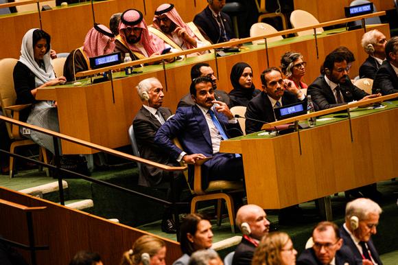 Les sièges de la Palestine vides, alors que le premier ministre israélien, Benyamin Nétanyahou, s’exprime au siège de l’ONU, à New York, le 26 septembre 2025.