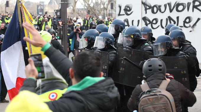 French gendarmes stand next to a graffiti reading ‘the power to the people’ as they face protesters near the National Assembly in Paris, on February 9, 2019 during the 13th consecutive Saturday of demonstrations called by the ‘Yellow Vests’ (Gilets Jaunes) movement. – The ‘Yellow Vest’ (Gilets Jaunes) movement in France originally started as a protest about planned fuel hikes but has morphed into a mass protest against French President’s policies and top-down style of governing. (Photo by Zakaria ABDELKAFI / AFP)